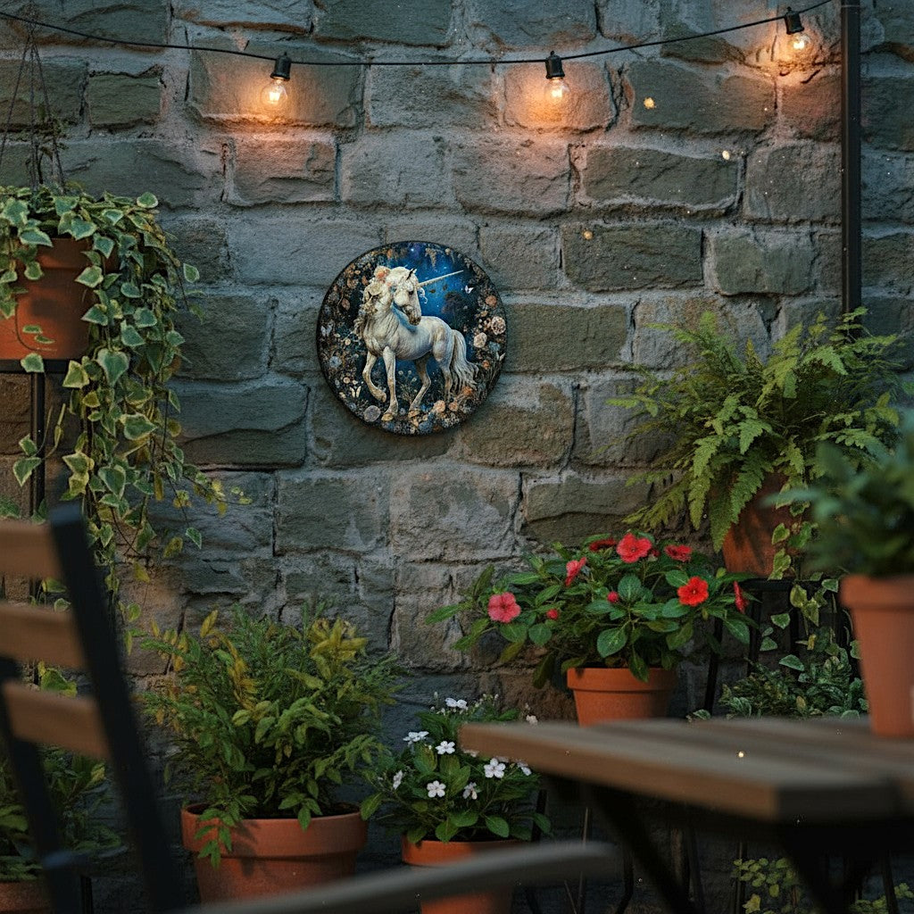 As the last glow of day fades into dusk, a radiant white unicorn steps softly into the enchanted glade. Surrounded by trailing vines, blooming flowers, and glowing butterflies, the Moonblossom Mare stands in tranquil majesty beneath a twilight sky — her silken mane kissed by moonlight, her eyes reflecting the stillness of an ancient forest. This 2D decorative metal plaque is a portal into that sacred moment, designed for those who believe in the untamed beauty of the mythical.